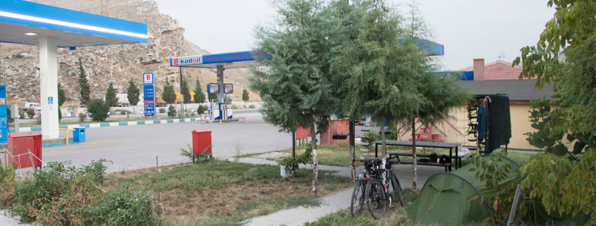With nowhere obvious to camp that evening, we cycled on to a petrol station in the town of Cayirhan and were immediately offered tea by the two gents whose job it was to fill vehicles with fuel. As we chatted, we asked them if they knew any good places that we could camp nearby and, after a little conference in Turkish between them, they very kindly invited us to pitch our tent on the grass beside the petrol station! They also offered us fresh, cool watermelon and, best of all, use of the staff shower. We slept well that night, albeit to the soundtrack of trucks pulling in to be refuelled.